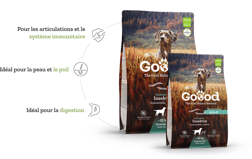Goood insecte est notre nouvelle recette hypoallergénique pour chiens à base de protéines d'insectes facilement digestibles mais également idéale pour les chiens souffrant de sensibilités nutritionnelles